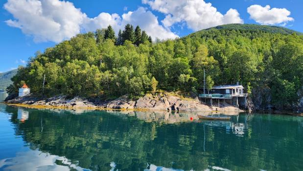 There were a lot of nice fjord views, of course. The weather was very nice, in fact one of the crew told us that today was one of the best weather days of the year. There are houses all along the fjords here like this one.