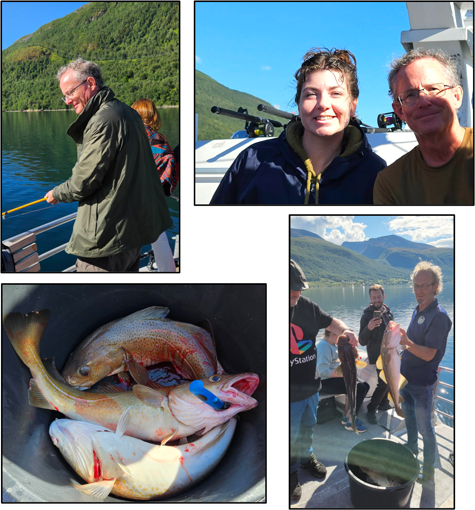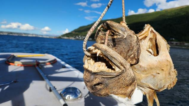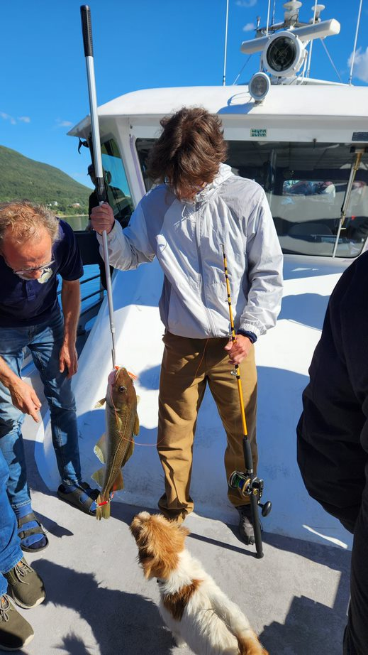 Close to the submarine base we did some more fishing and this kid caught another cod. The captain brought his two dogs on the boat and they like tugging on the tails of the live cod.
