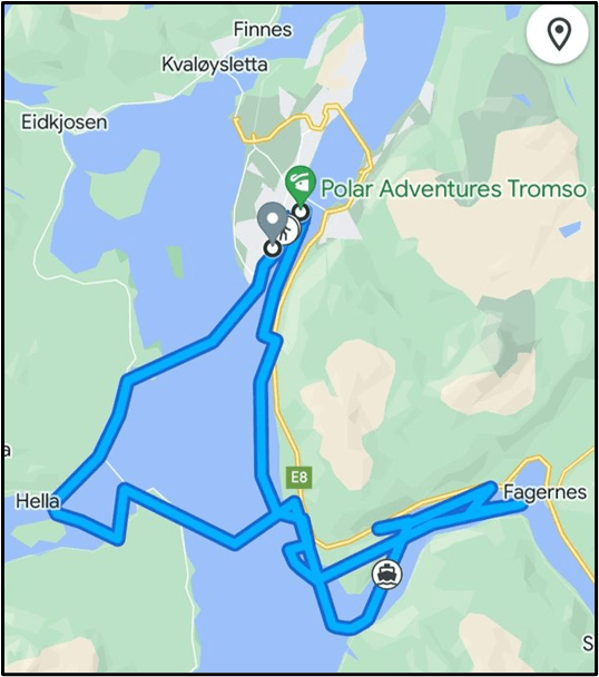 Here’s our Google Maps timeline of the trip. We were on three different fjords today.