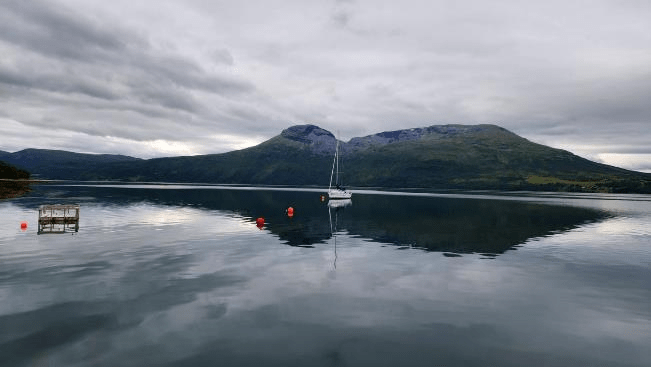 The farm has a sailboat that they keep out on the fjord. The water was quite calm today.