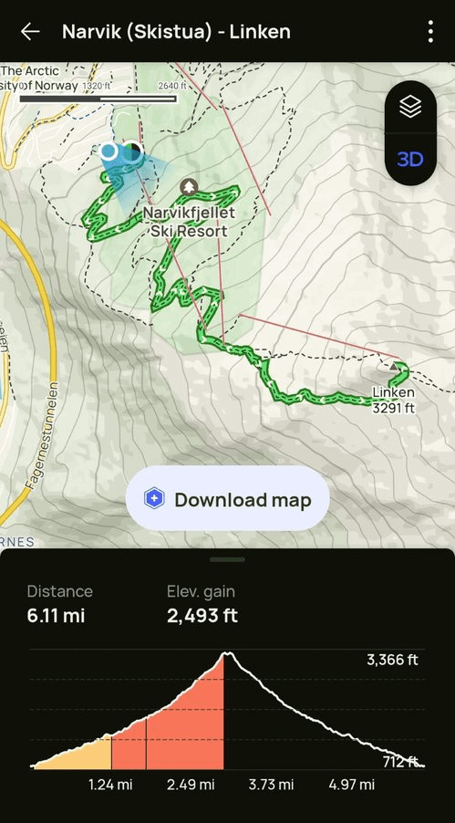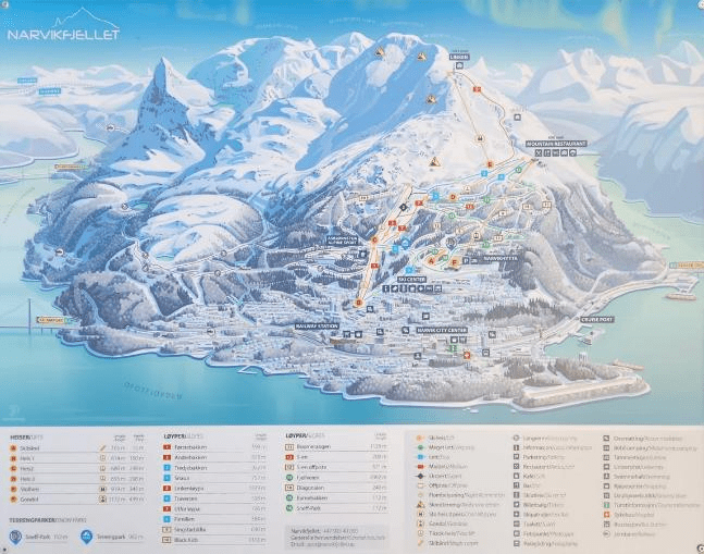 The road ended at the upper cable car station of the ski resort Narvikfjellet which is a pretty large one. Here’s a map of the routes and lifts and it also shows the town of Narvik at the bottom. I think Narvik is a popular skiing destination in the winter.