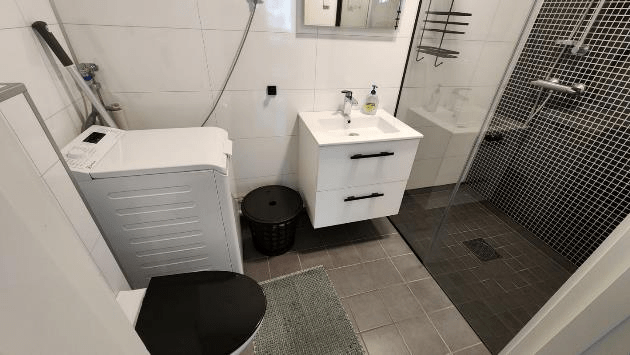 The bathroom is pretty roomy with a large shower.