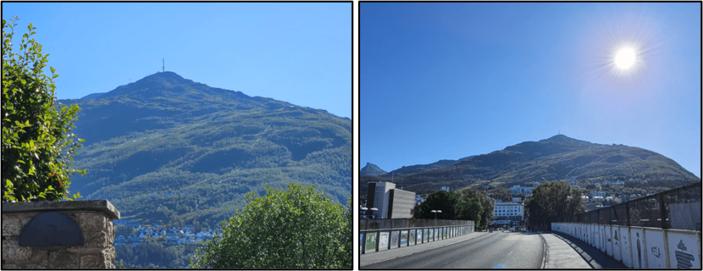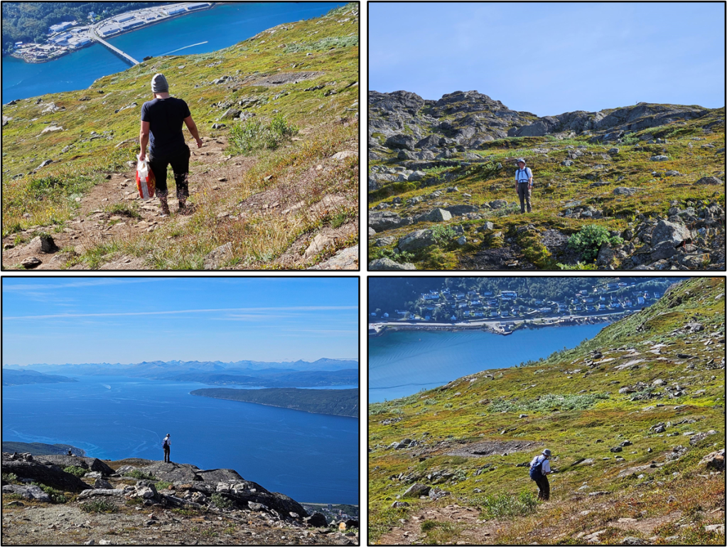 Today was had good weather day and there were many lovely things to see along the hike up and down the mountain. We’ve heard that getting outdoors and exercising is one of the things people in Norway enjoy. Indeed, there were a lot of people on the path today both walking and biking. There was a mountain bike trail on the mountain. We watched one guy get started on it by jumping the first ramp and then quickly disappearing down the trail. Hiking is, sensibly, prohibited on the mountain bike trail.