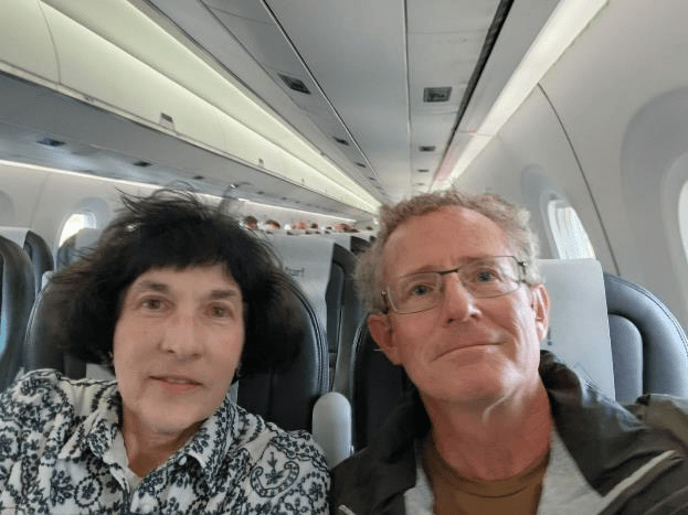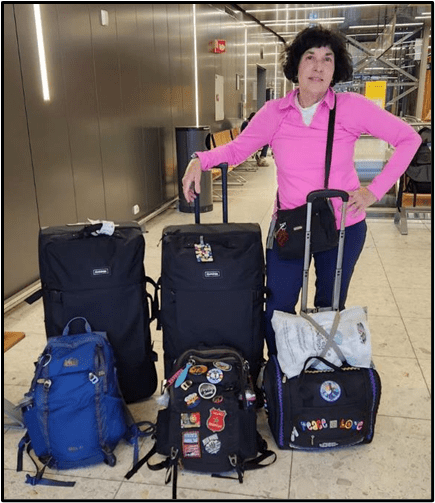 We had plenty of time to get checked in for our flight, which turned out to be a good thing because Patti’s checked bag was overweight and she spent some time lightening her load. She threw away some things, moved some things to her carryon bags, and I volunteered to pack a few of her things in my checked bag since my bag was less than the 23 kg maximum. I usually complain that Patti carries too much stuff with her wherever we go, but I won’t do that here. Or, maybe I just did?