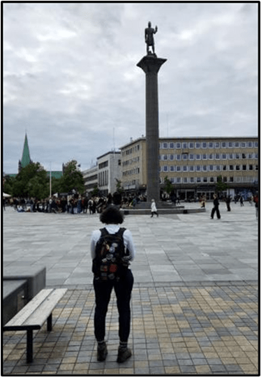 We walked into the main town square, called Torvet, where there is a famous statue of King Olaf Tryggvason on a column. Here’s Patti taking a picture of the monument.