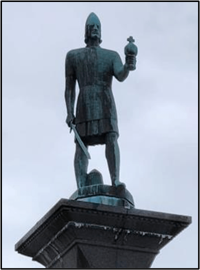“Olaf Tryggvason (960s – 9 September 1000) was King of Norway from 995 to 1000. He was the son of Tryggvi Olafsson, king of Viken (Vingulmark, and Rånrike), and, according to later sagas, the great-grandson of Harald Fairhair, first King of Norway. He is numbered as Olaf I. Olaf was important in the conversion of the Norse to Christianity, but he did so forcibly within his own kingdom. He is said to have built the first Christian church in Norway in 995, and to have founded the city of Trondheim in 997. A statue dedicated to him is located in the city’s central plaza.”