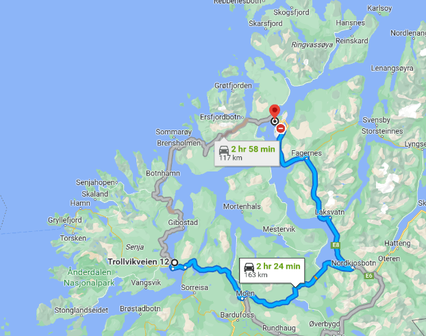 We had a long travel day ahead of us today so we got up early and left Finnsnes around 9:30 AM. Our drive was east and then north as you can see on this map.