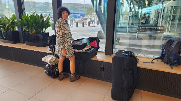 Here’s Patti in the airport with her checked bag open, working on unburdening it.