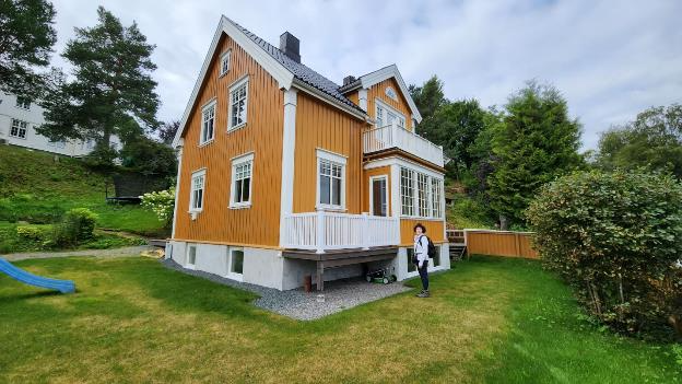 This Airbnb is a lower level / basement walk-out apartment in a big yellow house on Roald Amundsens Street. Here’s Patti in the yard with the house.