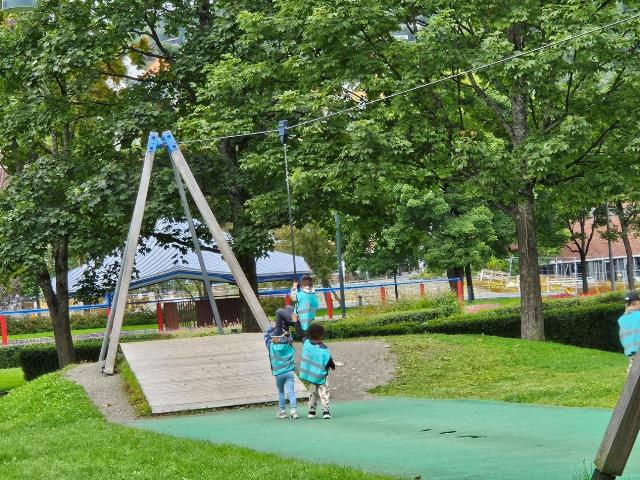 We walked by a local park where a kindergarten class was playing. They were enjoying this ride where one kid sits on a round seat and coasts down to the other side, sort of like a zip line. We’ve actually tried these out before at other playgrounds and they are fun. We do it when there are no kids around.