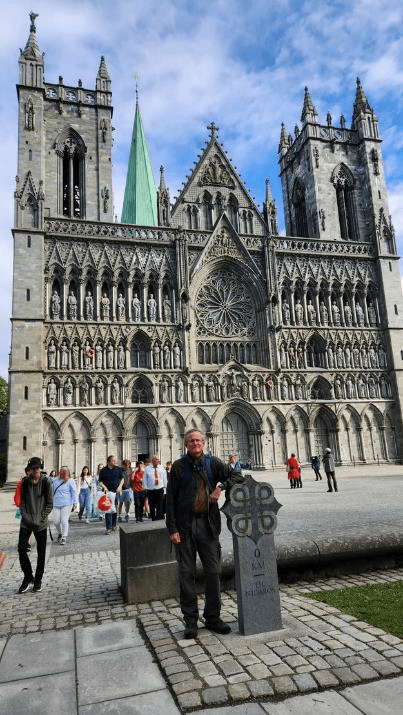 We walked by the Nidaros Cathedral — a very important site here in Trondheim. It’s the final resting place of King Olaf Tryggvason and also serves as the end of the pilgrimage trail from Oslo. Here I’m standing with the zero-kilometer milestone for the pilgrimage, in front of the cathedral.