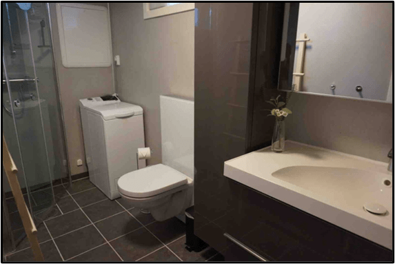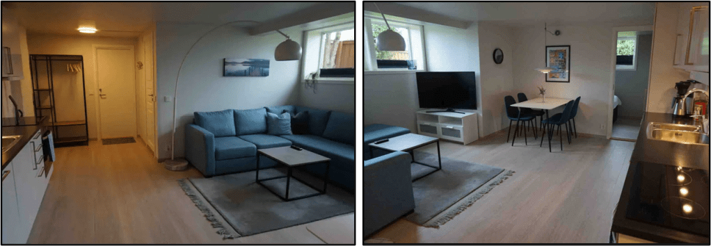Our journey through the Trondheim airport was quick and efficient. Our bags arrived shortly after we got to the baggage carousel. Our Airbnb host here recommended the train as the best way to get to her place from the airport. We bought tickets from the automated kiosk then settled into the waiting room. The train runs once per hour and we missed the last train by just a few minutes, so we had to wait another hour. Here’s Patti in the waiting room with our gear.