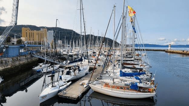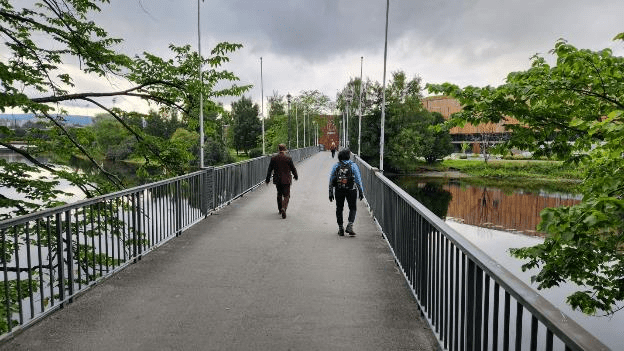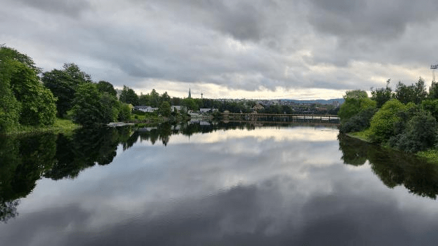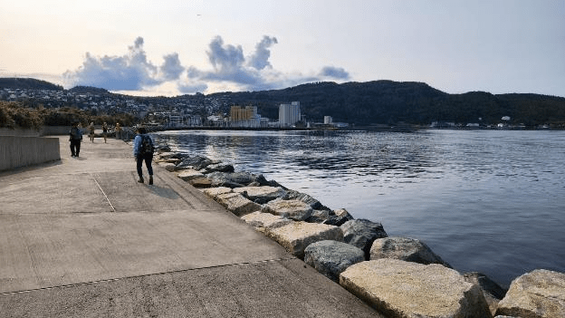 We crossed a pedestrian bridge over the Nidelva River which was very calm this morning, it may have been close to slack tide.