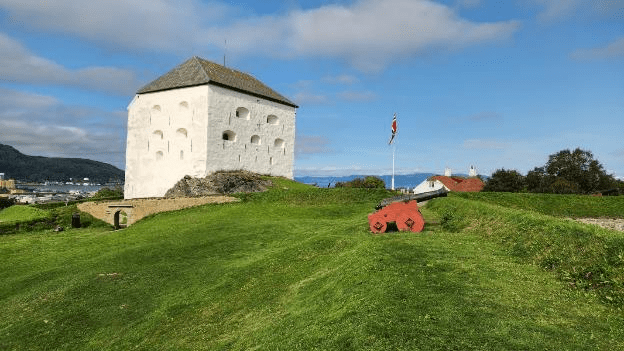 “Kristiansten Fortress (Norwegian: Kristiansten Festning, historically spelled Christiansten) is located on a hill east of the city of Trondheim in Trøndelag county, Norway, named after Christian V of Denmark-Norway. It was built after the city fire of Trondheim in 1681 to protect the city against attack from the east. Construction was finished in 1685. It fulfilled its purpose in 1718 when Swedish forces laid siege against Trondheim. The fortress was decommissioned in 1816 by King Charles XIV John.”