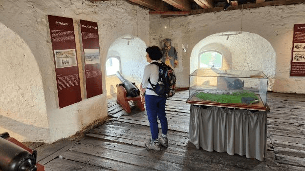 The tower, painted white, is within the fortress walls and is now a nice little museum with lots of information, in English and Norwegian, about the military history of the fortress.