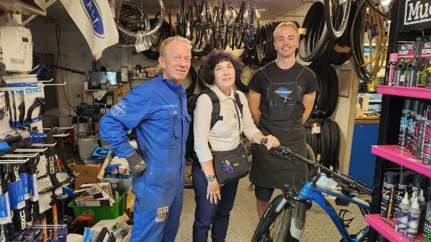 We went in the bike shop door to admire the inner courtyard and two guys in the shop came over to chat. We ended up spending about 20 minutes with them. The older guy retired last year, at age 63, and now works in his brother’s bike shop. He said his pension is about $2,500 USD per month. In Norway they can retire at age 62, but every additional year they work their pension increases, similar to how the U.S. Social Security program works. The younger guy was in the army and now works at the shop. They gave us a tour of the shop and talked to us a bit about bicycle brands. It was a nice stop for us, and here’s Patti with the guys.