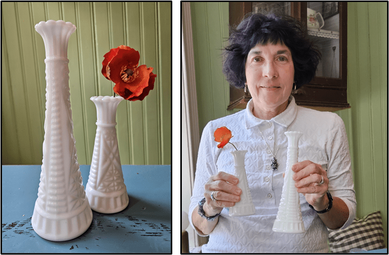 Patti was excited to discover two white flower vases sitting on the tables. She says were distributed by Avon (ordered from a booklet from an “Avon Lady” as they were called back then) in the 1960s or 1970s, and they probably had either perfume or lotion in them. She actually has two of these vases that she got from her Mother — they are currently packed up safely in boxes in our storage space in Sarasota, Florida (USA).