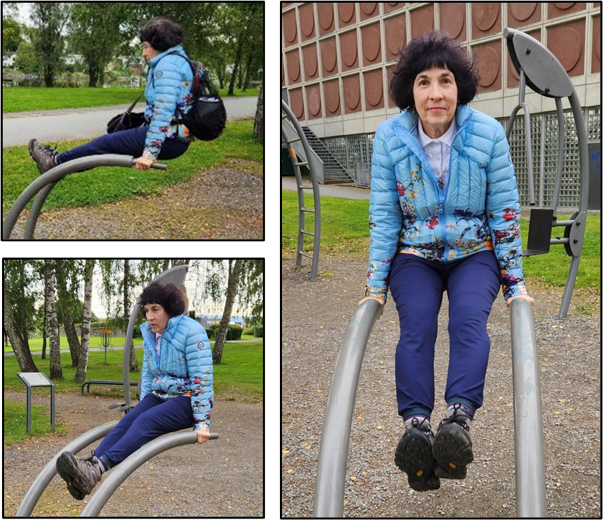 We came to an area along the river with exercise and play equipment. Patti decided to see if she could do an L-Sit and accomplished it easily. Earlier this year (in March) she fell and fractured a few bones in her rib cage while trying to do an L-Sit on some parallel bars at the RV Resort we were staying at in Jacksonville (as she was falling, her right-side rib cage area slammed directly on the top of a 4×4 wooden post that held up the bars). I’m thinking that now she wants to prove she can do it without injury. She says she believes the parallel bars in Jacksonville where further apart, and therefore, that is the reason why she fell, and wasn’t able to perform the move properly.