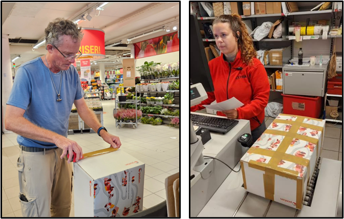 Based on what we’ve seen, the post offices in Norway are located in the grocery stores. The closest one was at the Coop Extra grocery where we’ve been shopping. When we arrived at the store, we bought some packing tape, and I strapped the box with it, while Patti completed the shipping form. Earlier this morning, I created an Excel spreadsheet itemizing everything we were shipping. We came up with a value of $365 USD for customs purposes and we put that on the shipping form. The worker there was from Germany. She said she moved to Norway 20 years ago, when she was 15, with her family. We chatted with her as we completed the paperwork. Below are pictures of me taping up our box, and of the young lady preparing our package for mailing.