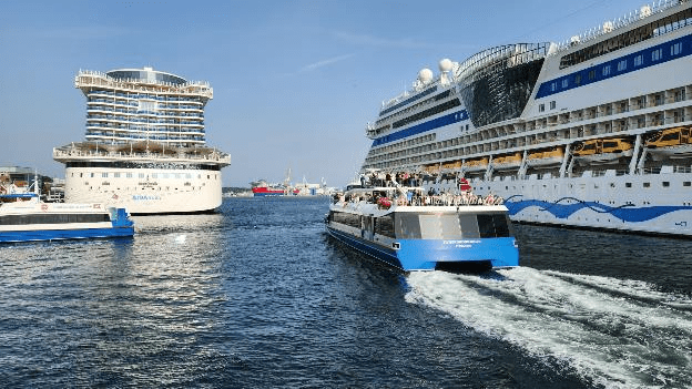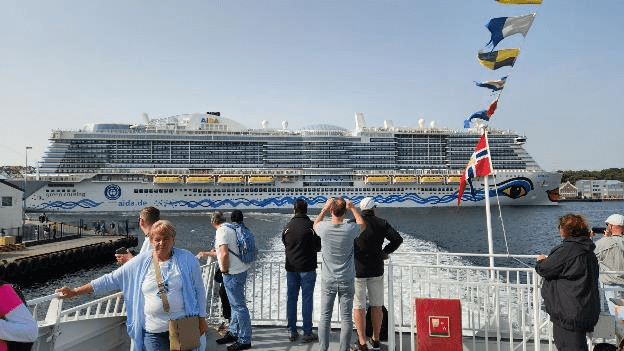 While we were in line to get on our boat we talked to the German tourist couple behind us who were on one of the cruise ships. They left from the port of Kiel in Germany and are having a “shore excursion” to Lysefjord today. As we left the harbor, we had a nice view of their AIDA cruise ship off our stern. All the AIDA ships we’ve seen have the woman’s lips, eyes, and hair as a decoration at the bow.