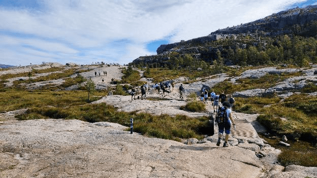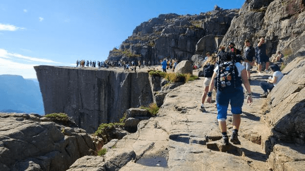 Tourism at the site has been increasing in the early 21st century, with between 150,000 and 200,000 visitors in 2012, making it one of the most visited natural tourist attractions in Norway. BASE jumpers often leap from the cliff. Due to its increased popularity, the most used path to the site (a 3.8-kilometre (2.4 mi) long hike) was improved by Nepalese Sherpas in 2013.”