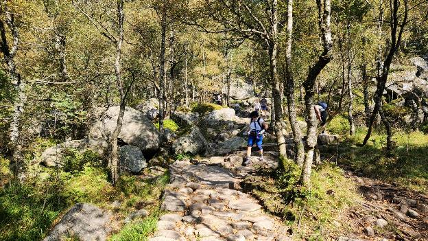 The bus dropped us off at the Preikestolen Base Camp where there is a hotel, restaurant, gift shop, toilet, and drinking water. We had five hours, 11AM to 5PM, to accomplish the hike and be back on the bus. I was a bit stressed out about that since we typically hike very slowly. So, we had developed a plan where we would hike steadily, not making lots of stops to take pictures along the way, and hopefully not miss the bus. So when we got off the bus we quickly headed up the trail which was well marked and there were LOTS of hikers on it.