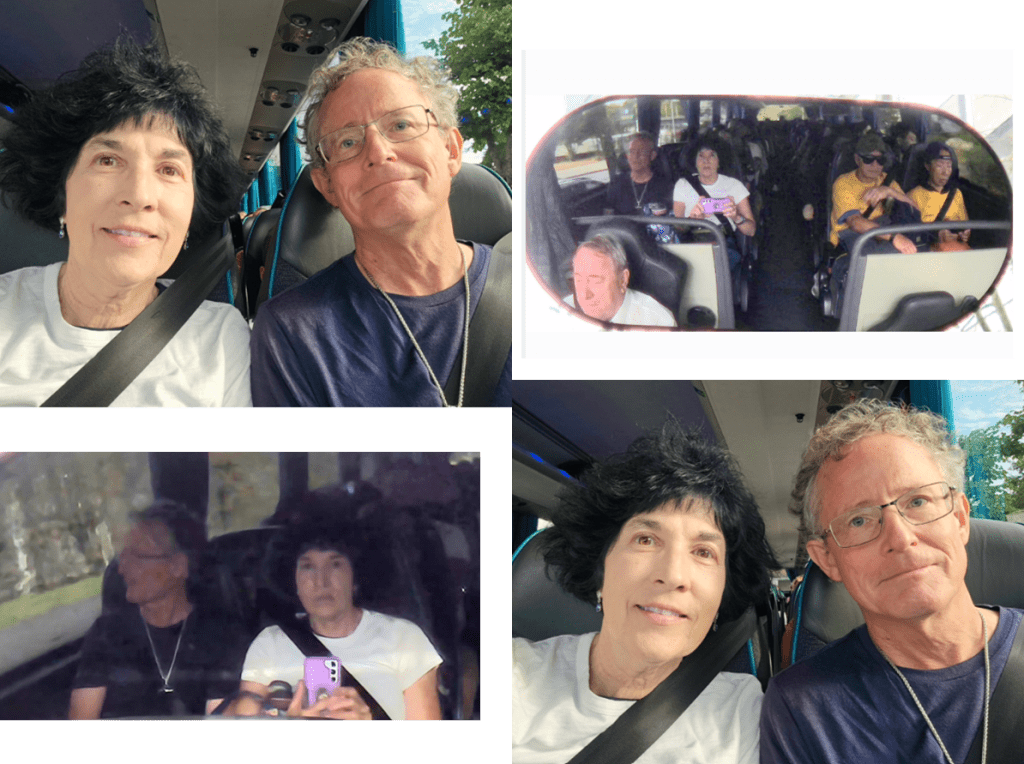 We took some bus selfies, including some “reflection” selfies that Patti took into the bus’s rear-view mirror.