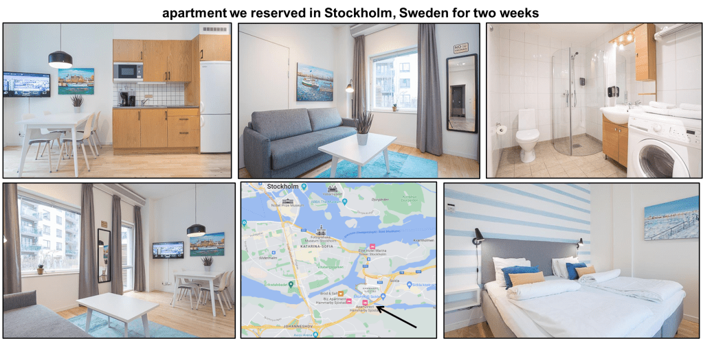 We logged onto the computer this morning to book an Airbnb in Stockholm, Sweden, but the two places we “favorited” yesterday were no longer available! We spent some time looking at other options, then went out for a run. Upon our return, we decided to conduct an online search and found the website for the same management company (ApartDirect) listed on the Airbnb site for the apartments we like and booked an apartment directly from the company, which by the way, has multiple locations throughout the city. The apartment we reserved is in an area not too far from the city center of Stockholm, and is close to public transportation. Shown below are some pictures of the apartment we will be staying at in Stockholm. Apparently, the washing machine is also placed in the bathroom in Sweden!