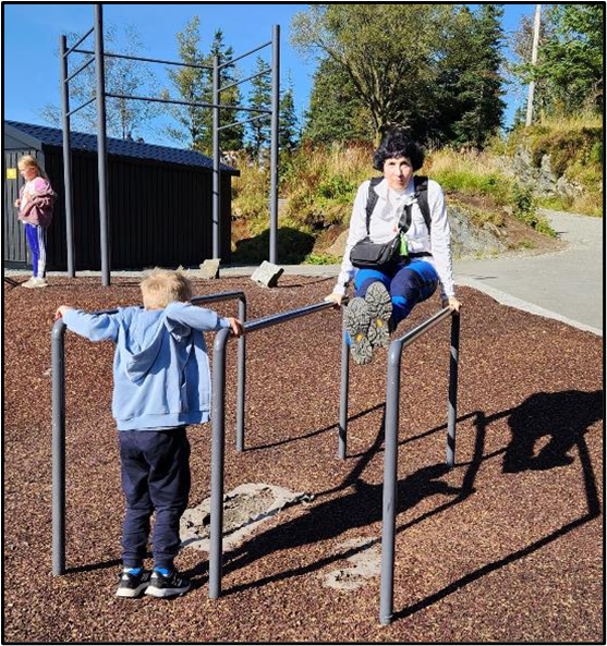 We ate our picnic lunch on some stone steps along with lots of other people then walked around the area. There were numerous playground areas with kids running around and playing everywhere. Patti decided to try an “L-Sit” again, and the boy in the blue jacket was trying it too.