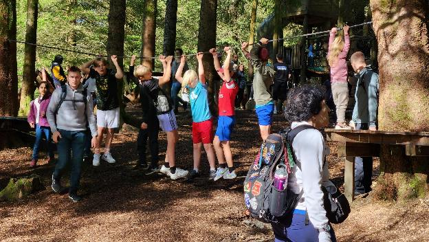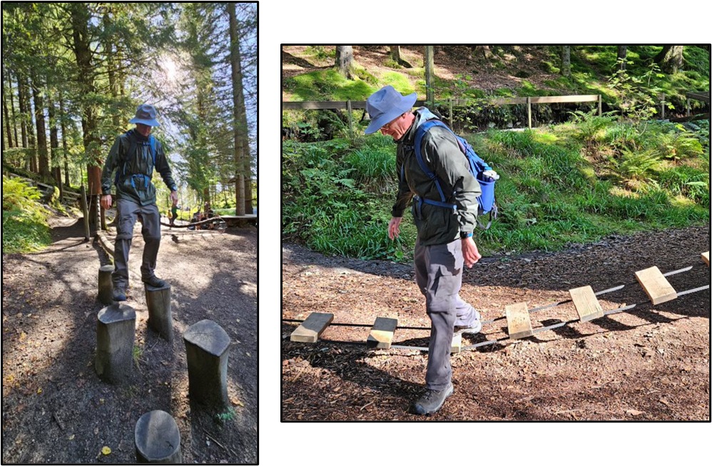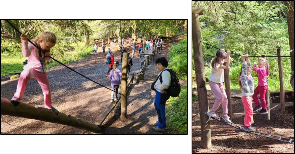 We both attempted to complete some of the obstacle courses . . . needless to say, they weren’t easy to accomplish. Walking from tree stump to tree stump took some concentration and walking along the swinging ladder was tricky. The children tackled these activities with ease, while we both struggled. I believe our issue is that we were thinking about what we were doing, and therefore, moving slowly, while the kids just go and do it without thought.