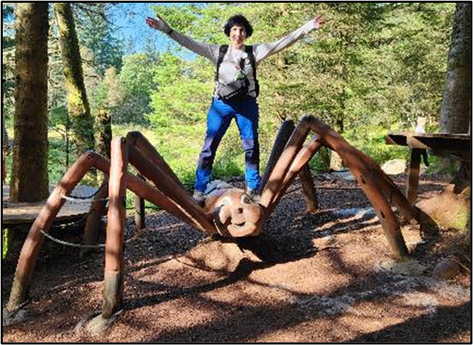 Here’s Patti standing on a giant spider.
