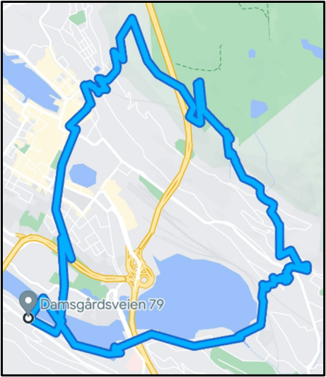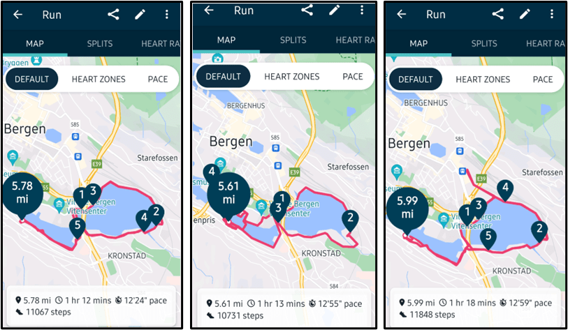 Shown below are some statistics from Patti’s last three runs around Store Lungegårdsvannet.