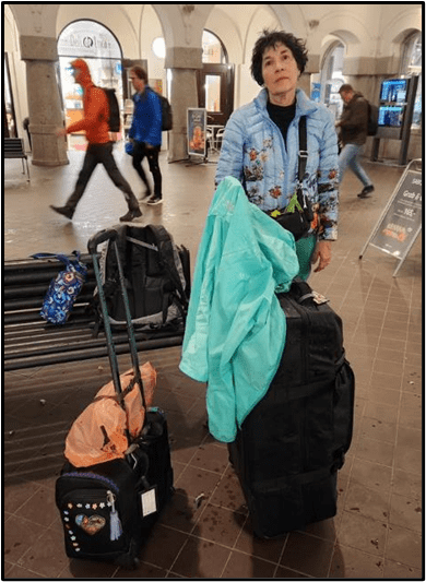 We were up at 4:30 this morning to get ready for our train trip to Stockholm. It was, as usual in Bergen, raining. We wore our raincoats but our large suitcases don’t have rain covers so we had to pull them through the rain, up a hill, to get to the bus stop. I took this picture at the bus stop, I don’t think Patti was thrilled about pulling her luggage in the rain.