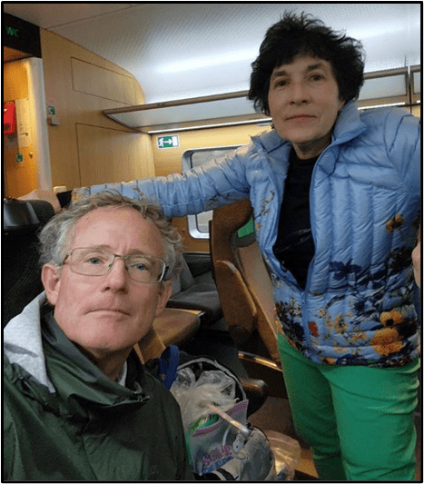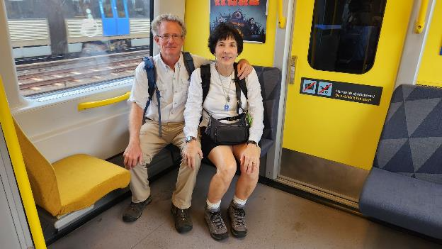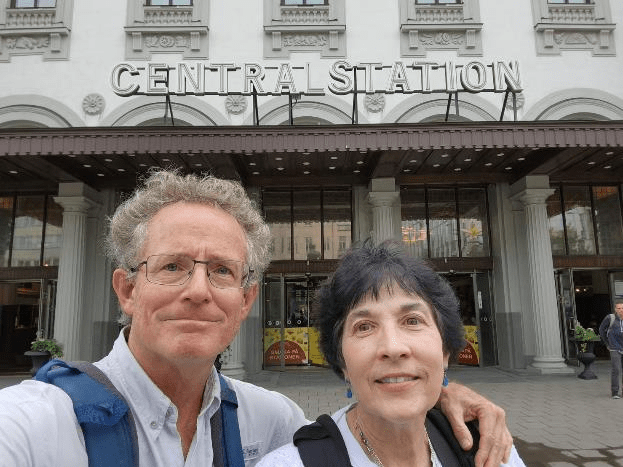 We only have to walk a block and a half to get to the nearest Tram station and from there we take the #30 Tram to the Gulmarsplan station where we transfer to the subway which we ride north to the Central Train Station of Stockholm. Here we are on the subway. I was trying to get a selfie but a nearby woman offered to take our picture.