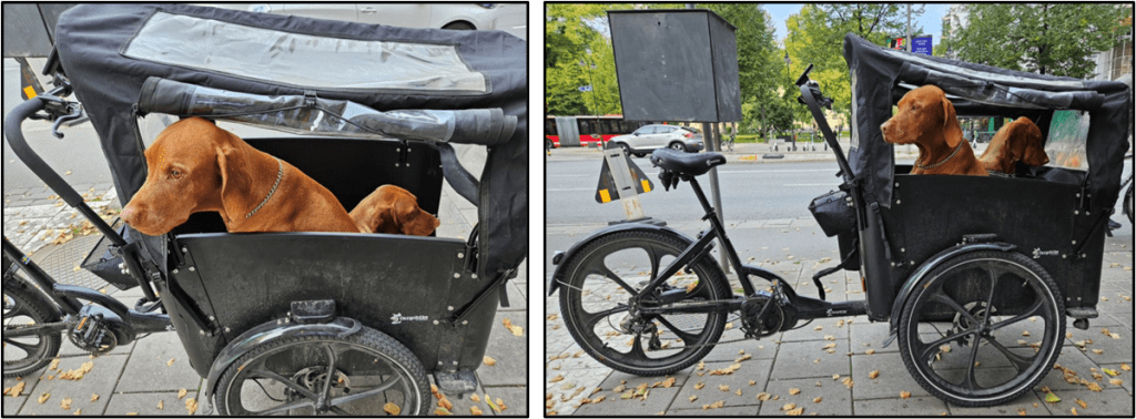 As we approached the first stop on our walking tour, we saw these two dogs in an interesting wheeled conveyance. They were very quiet waiting for their owner to return.