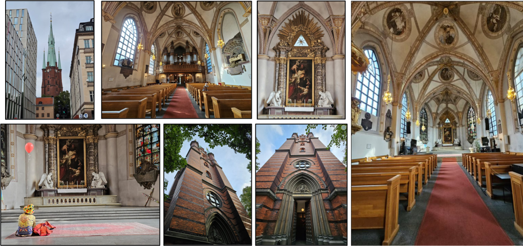 The train station is actually in the Norrmalm district just to the west of Östermalm. As we walked toward the starting point of our self-guided walking tour the first thing we saw was this church at the end of a street between two buildings.
