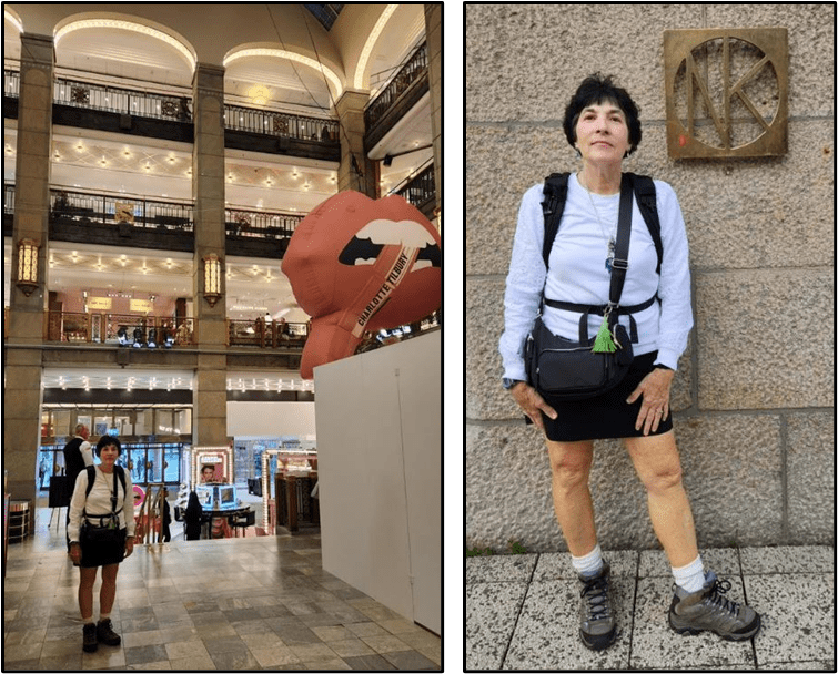 After the church we walked along busy streets with lots of stores, shopping malls, and department stores. Here’s Patti outside Åhléns.