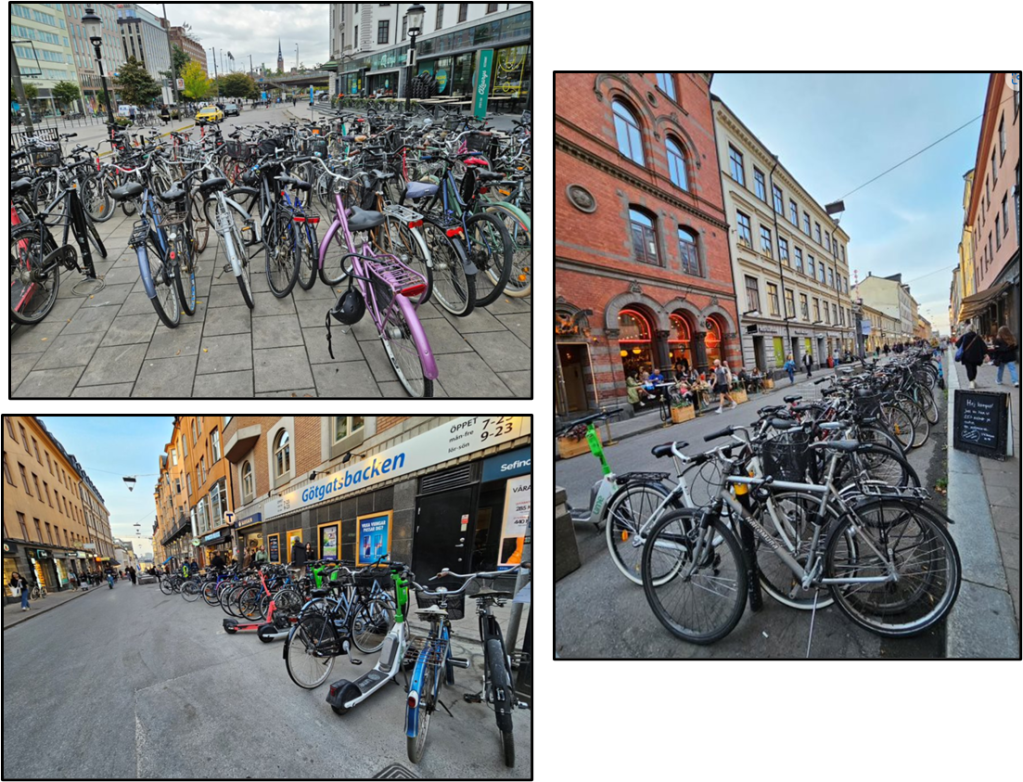 There are an abundant number of bike riders here in Stockholm, and it’s not the children riding bikes, it’s the adults. Nearly every apartment building and every office building has a cluster of bikes parked in front of their buildings. Instead of driving cars or taking public transportation, they commute to work on their bikes!!!