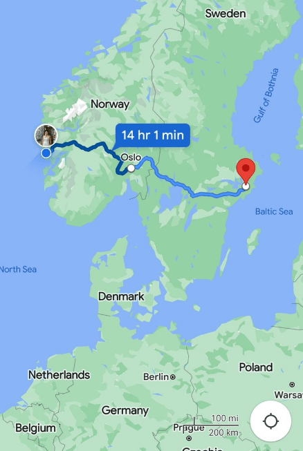 We rode two trains today, one from Bergen to Oslo and then we changed trains in Oslo to go to Stockholm. This is our path. We went from the North Sea to the Baltic Sea.