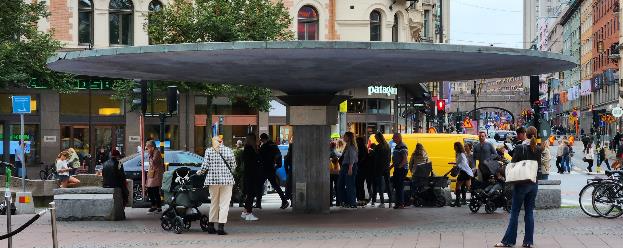 “The ‘Svampen’ is a concrete rain cover designed by Holger Blom in 1937. It was originally constructed as a rain cover and designed to house a small kiosk that was built around the central pole. This made sense at the time, as it was located in the middle of a traffic triangle of an important junction.”