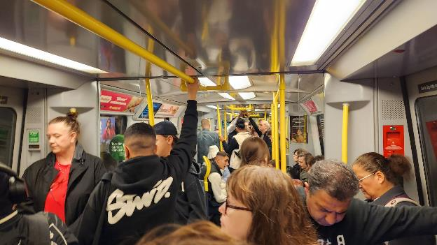 The trip took about 45 minutes. The subway was pretty crowded at this time of the evening, standing room only. We found yellow poles to hang on to.
