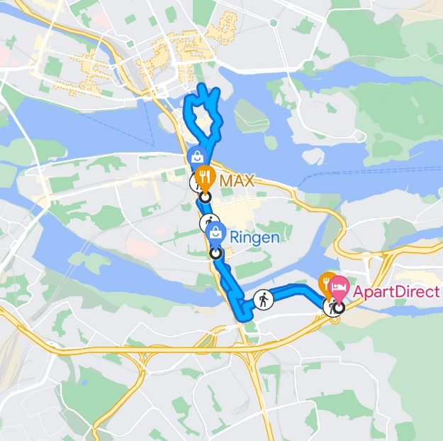 Around noon we took an informal walking tour north from where we’re staying up into some of the islands of Stockholm. Stockholm is built on 14 islands and each one seems to have its own personality. Here’s a map of our walk today.