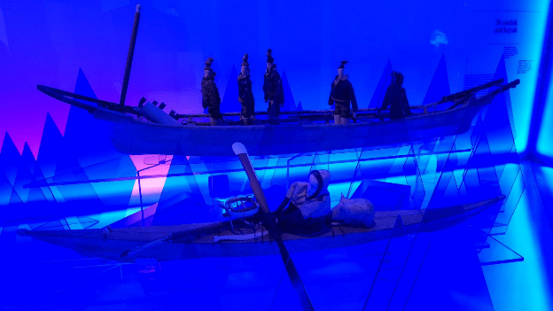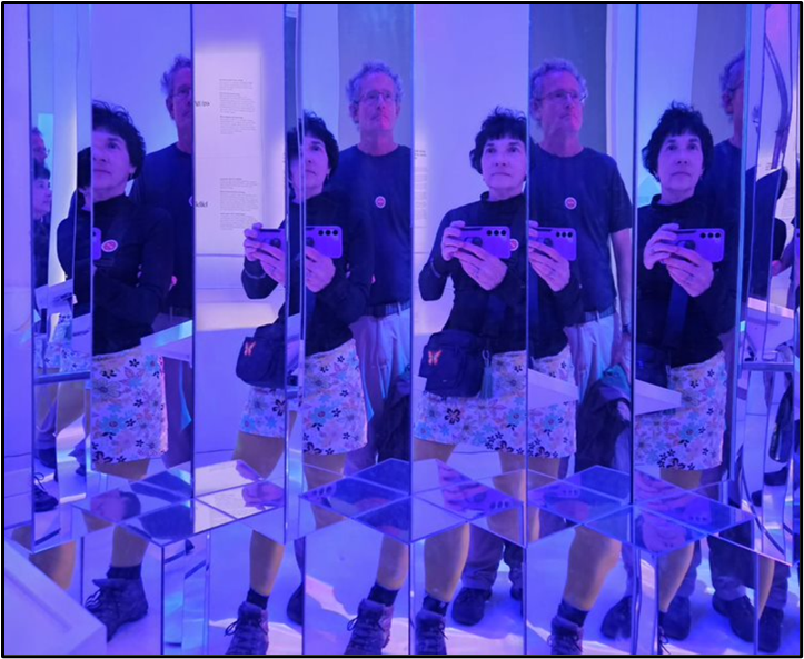 The next exhibition was about indigenous people of Sweden. There was a folded mirror in the room, so we took a customary reflection photo.