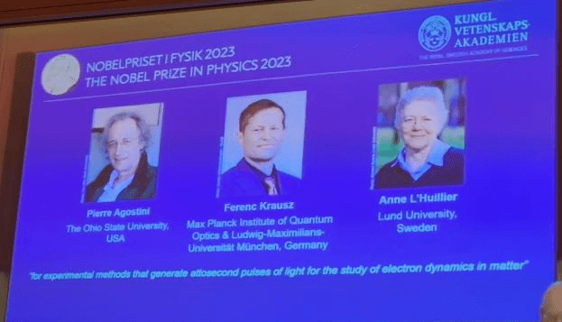 This year the physics prize was given to three people: “for experimental methods that generate attosecond pulses of light for the study of electron dynamics in matter”.