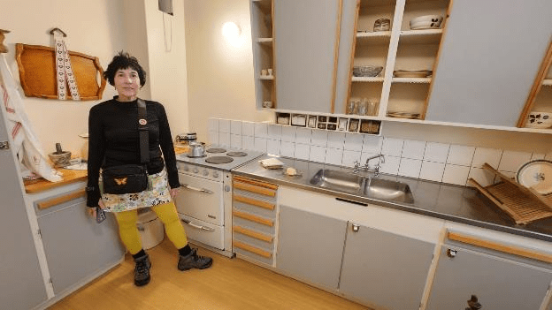 The first exhibition was a 1940s apartment that demonstrated how the new apartments were being built at that time. Here’s Patti in the kitchen.