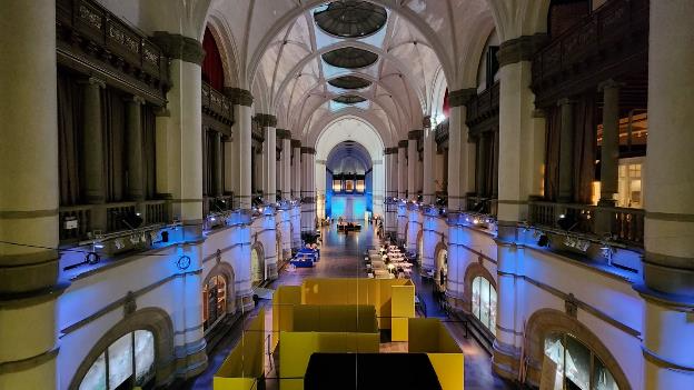 Inside, the Great Hall is three stories high and there is exhibition space around the perimeter of all three floors.
