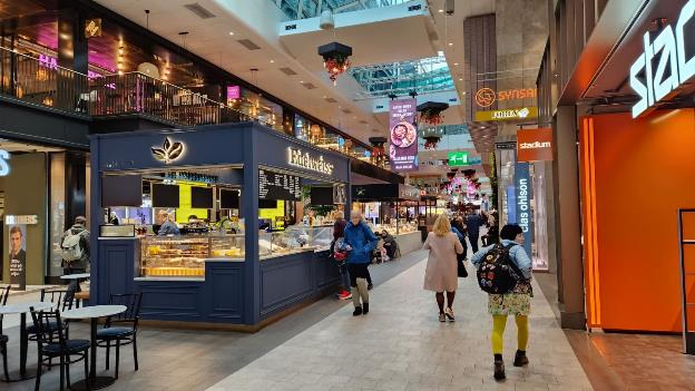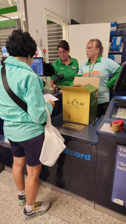 In the afternoon we walked over to the Coop grocery store because Patti wanted to ship a box of things back to the US. The PostNord outlets, the official government post office in Sweden, are in grocery stores, just like in Norway. Similar to Norway, the shipping process was easy and relatively inexpensive compared to other countries from which we’ve shipped boxes back to the states. There were two women who worked with Patti on this because this is not something they often do, but they seemed to enjoy the challenge. Here’s Patti at the PostNord. We got the empty box from the liquor store across the street. Shipping cost was about $70USD for a 12-pound box.