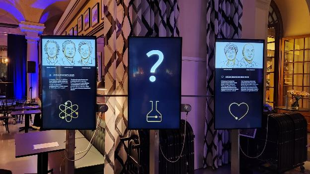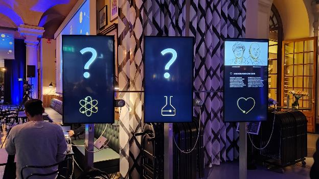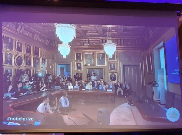 This week they are announcing the 2023 Nobel Prize winners, one per day, at 11:45 AM every day. They put the winners up on the monitors in the lobby. Yesterday they announced the winners in Medicine and today they announced the winners in Physics. Here’s the monitors before the announcement…