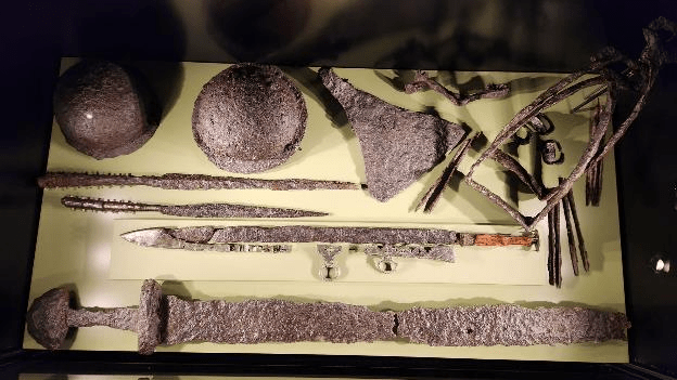 Here’s a hoard find of eleven tongue-shaped silver grivnas which was a currency back then.