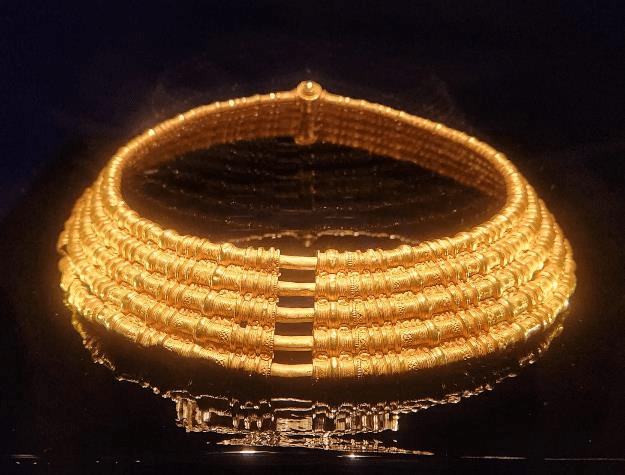There are three gold neck rings here, which are particularly rare. This one is from Fårjestaden, on the island of Öland. The space between the five hollow rings is filled with a host of minute, highly stylized figures.